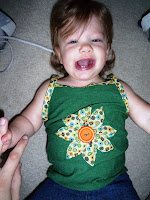 I am really excited to tell you about this one! I have been really nervous about attempting to make clothes in the past because I can be such a perfectionist that I get frustrated and stop working on something if it doesn't go the way I planned. Somehow, this turned out just how I planned! I have a bag of clothes I've been meaning to give away to Goodwill. They've been sitting in my closet for about 4 months now (procrastination much?) After finding this "Easy Breezy Tank" tutorial on Craftiness is Not Optional, it looked like something I could try. Having never made clothes before, I was feeling adventurous and up to the challenge. After digging around, I found one t-shirt in my clothes bag that I thought would work. And that's how I turned this:  into this:  Since I didn't have a template to go off of, I simply took one of my daughter's 18-month old tank tops and laid it on top of the green t-shirt. Then, I traced around it with disappearing ink (adding an extra 1/4 inch on all sides for seam allowance) and pinned the shirt so that I could easily cut around it, giving me my front and back pieces. I followed the tutorial above for the most part, but I didn't make the elastic neckline. Instead, I made my own bias tape (just as the tutorial explains how to do for the straps) and lined the front and back of the neck with it.  After finishing sewing and lining the shirt, it didn't seem quite finished. I knew I wanted to add an embellishment to it, so I decided to make a cute flower decal, but I didn't want it to be typical. I started by tracing a pattern for a petal. I cut out 8 flower petals and lined them up in pairs, overlapping the edges some. I then took a needle and thread and sewed all of them together by sewing several small stitches on the bottom (flat part) of each petal. After they were all joined together, I pulled the thread and all of them bunched up nicely. Then, join the ends of the end 2 petals by making a circle, and make a couple of stitches to join the 2, like this:  From there, I pinned the flower to the tank top, sewed around the entire perimeter, then added a large button in the middle to finish it, and voila! Instant cute baby tank! The entire project probably took me about 4 hours, but it took a little longer with constant interruptions thanks to bedtime and an active toddler. I am so happy with how this turned out though. I will never throw another t-shirt out again!